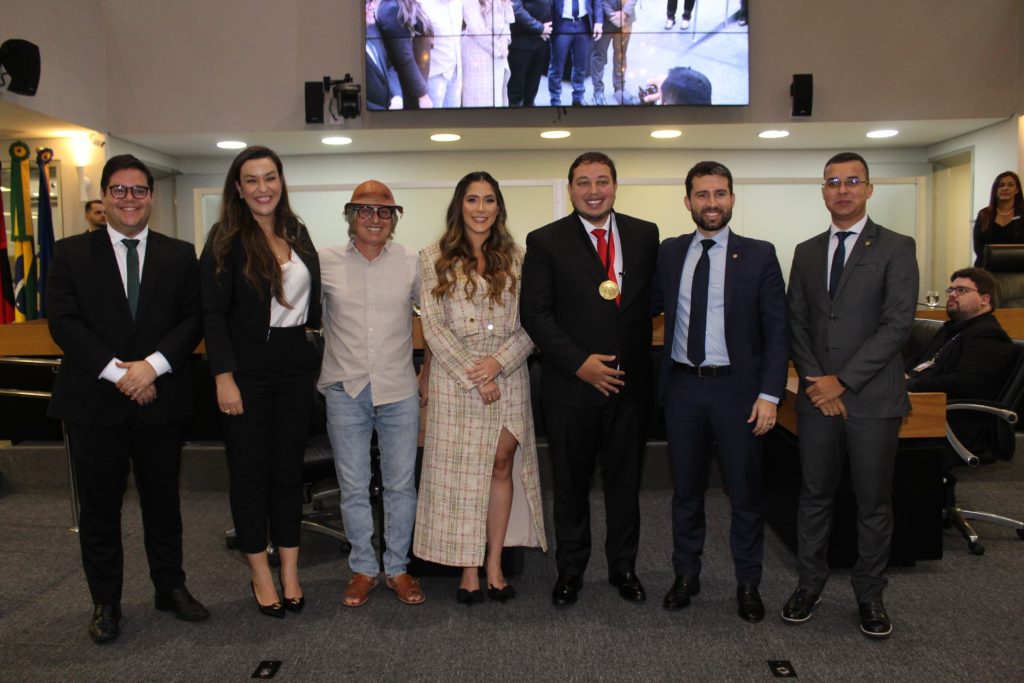 A Assembleia Legislativa realizou sessão solene, na tarde desta quarta-feira (10), para outorga da Medalha Ednaldo do Egypto ao humorista, youtuber e influencer paraibano Renan Andrade Oliveira, conhecido nacionalmente por Renan da Resenha. O evento proposto pelo deputado Michel Henrique aconteceu no Plenário “Deputado José Mariz” e contou com a presença dos deputados Anderson Monteiro, Camila Toscano, Alexandre de Zezé; o radialista humorista Rodrigo Vieira Emerenciano (o “Mução”); amigos, parentes e amigos do homenageado.