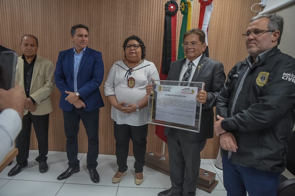 O presidente da Assembleia Legislativa da Paraíba (ALPB), Adriano Galdino, foi homenageado, nesta terça-feira (05), pela Polícia Civil do Estado, durante cerimônia no Centro Integrado de Comando e Controle da Secretaria de Segurança, pelo reconhecimento do seu trabalho em apoio à instituição e às iniciativas de combate à violência contra a mulher.