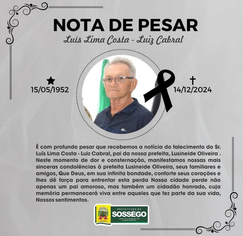 O presidente da Assembleia Legislativa da Paraíba (ALPB), Adriano Galdino, em nome de todos os parlamentares e servidores da Casa Epitácio Pessoa, vem a público lamentar o falecimento do senhor Luis Lima Costa, pai da prefeita de Sossêgo, Lusineide Oliveira.