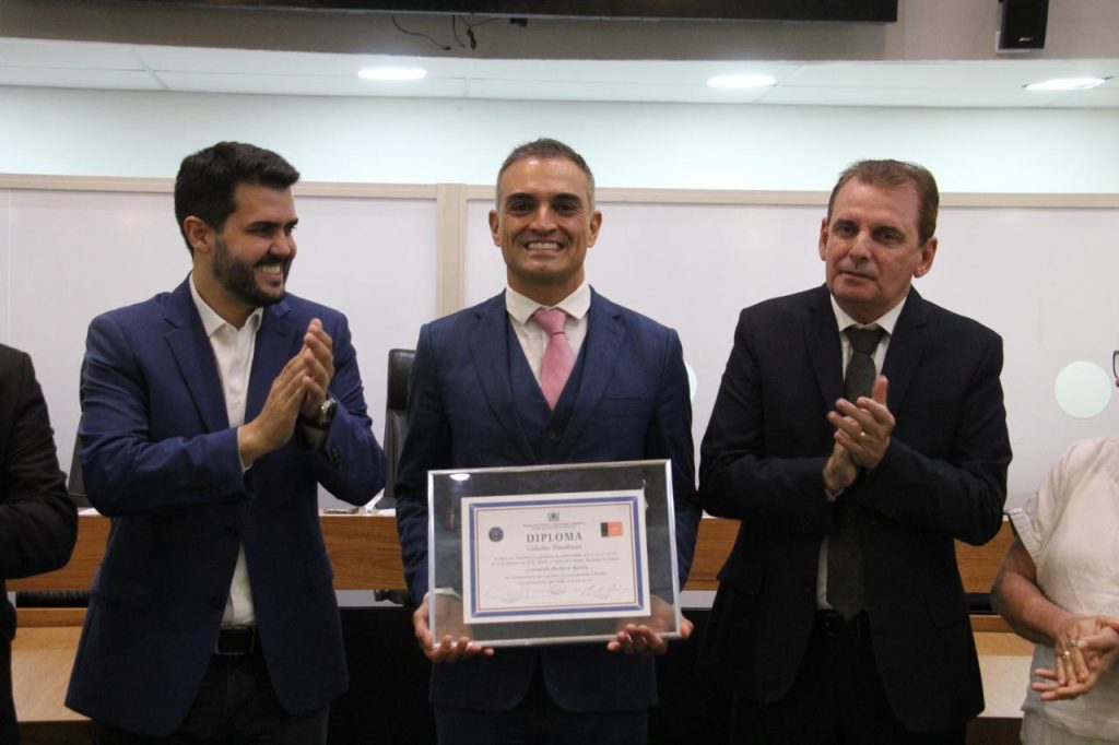 A Assembleia Legislativa da Paraíba (realizou) sessão solene, na tarde desta quinta-feira (22), para outorga do Título de Cidadão Paraibano ao economista e bacharel em Relações Internacionais Leonardo Bichara Rocha, “pelos seus relevantes serviços prestados ao estado. O evento, presidido pelo deputado Chico Mendes, aconteceu no Plenário “Deputado José Mariz” e contou com a presença de gestores públicos, estaduais e municipais, parêntese amigos do homenageado.