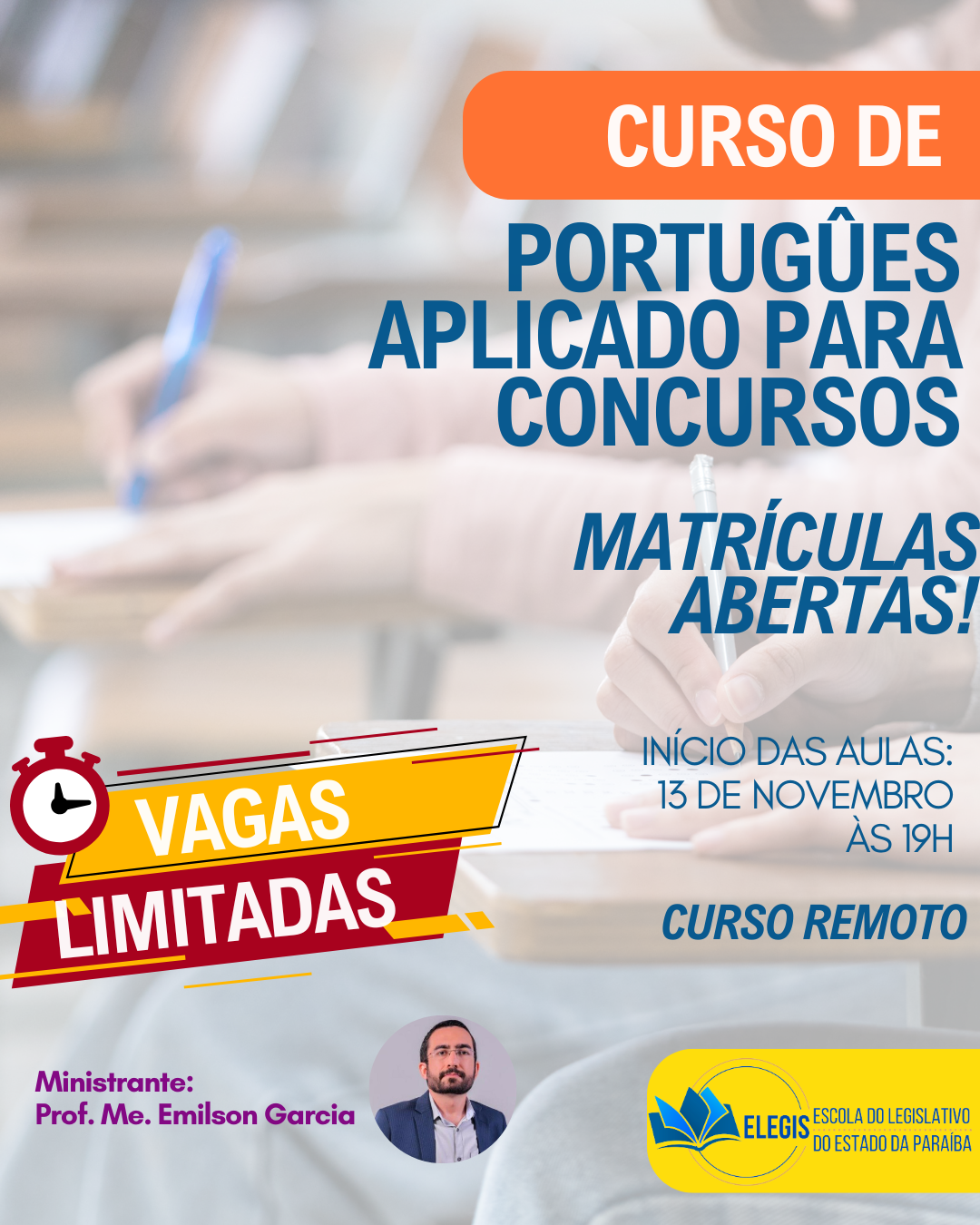 A Escola do Legislativo do Estado da Paraíba (ELEGIS) está com inscrições abertas e totalmente gratuitas para o Curso de Português Aplicado para Concursos, uma oportunidade de qualificação voltada a quem deseja ampliar suas chances de aprovação em seleções públicas.